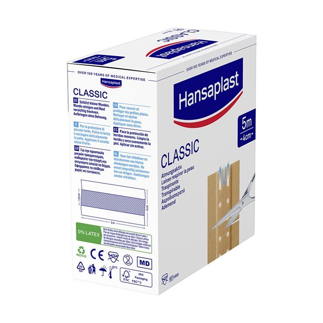 Hansaplast Classic ist ein atmungsaktiver, textiler Wundschnellverband für die schnelle, einfache und hygienische Versorgung verschiedenster Wunden. Die Meterware ist in drei Breiten erhältlich und kann individuell zugeschnitten werden. Hansaplast Classic besteht aus einem Viskoseträger mit Vlieswundauflage und ist latexfrei. Die extra starke Klebkraft sorgt für langen und festen Sitz des Pflasters.