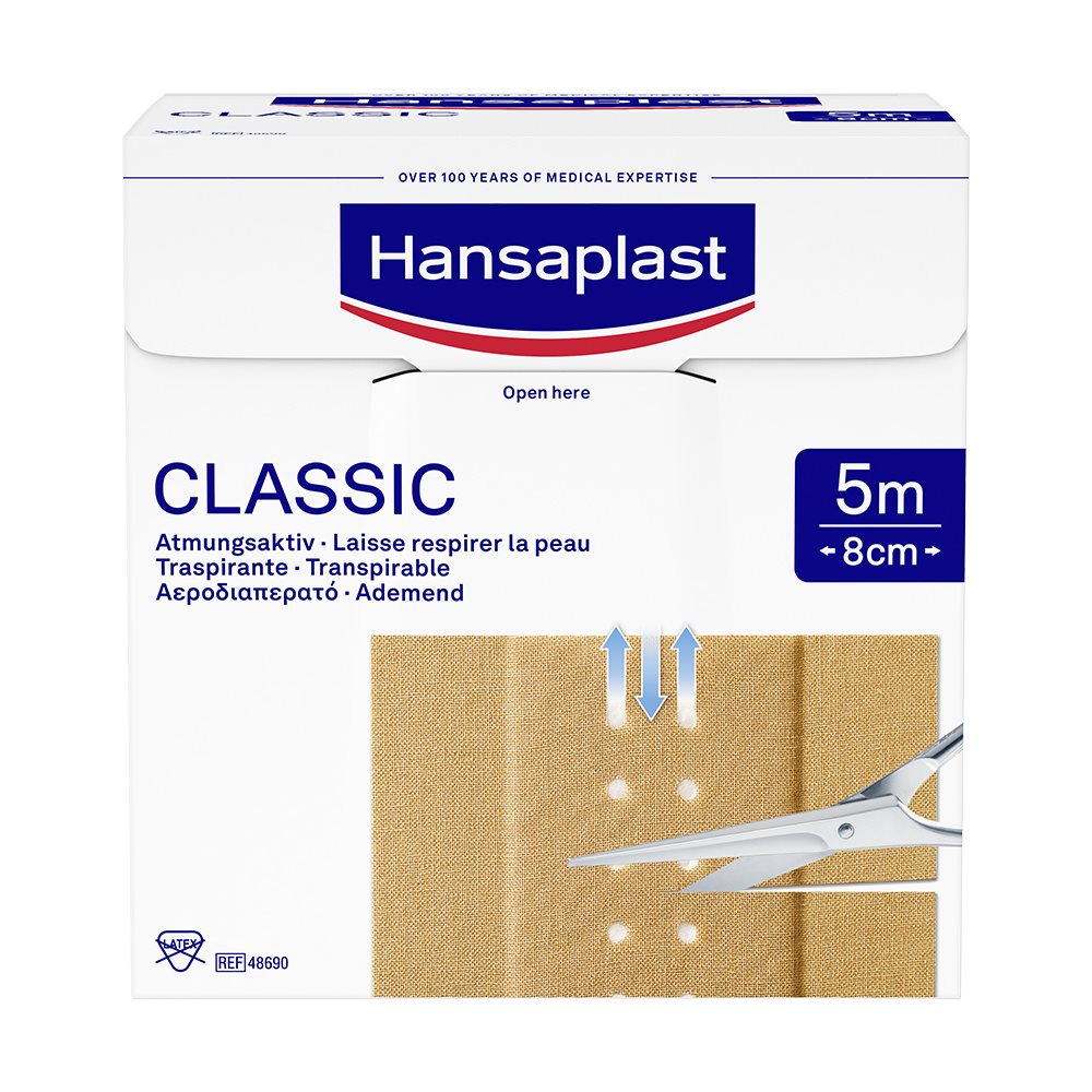 Hansaplast Classic ist ein atmungsakativer, textiler Wundschnellverband für die schnelle, einfache und hygienische Versorgung verschiedenster Wunden. Die Meterware ist in drei Breiten erhältlich und kann individuell zugeschnitten werden. Hansaplast Classic besteht aus einem Viskoseträger mit Vlieswundauflage und ist latexfrei. Die extra starke Klebkraft sorgt für langen und festen Sitz des Pflasters.