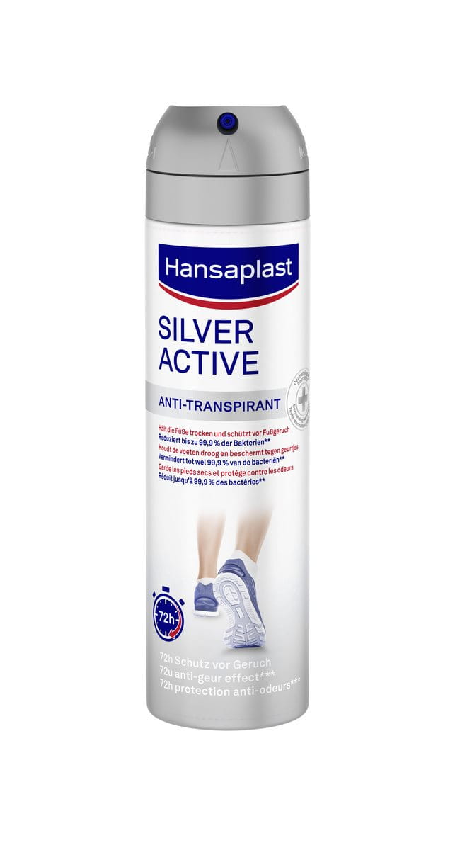 Ein Fußspray sollte also einen Anti-Transpirant Schutz bieten und die Schweißbildung verringern. Innovative Produkte wie Hansaplast Silver Active Fußspray enthalten darüber hinaus antibakterielle Silber-Ionen, die gegen die für die Geruchsbildung verantwortlichen Bakterien wirken und so langanhaltend vor unangenehmen Geruch schützen und der Entstehung von Fußpilz vorbeugen.