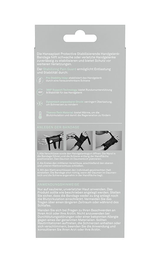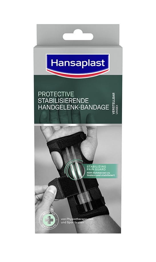 Die Hansaplast Protective Stabilisierende Handgelenk-Bandage hilft schwache oder verletzte Handgelenke zuverlässig zu stabilisieren und bietet Schutz vor weiteren Verletzungen.